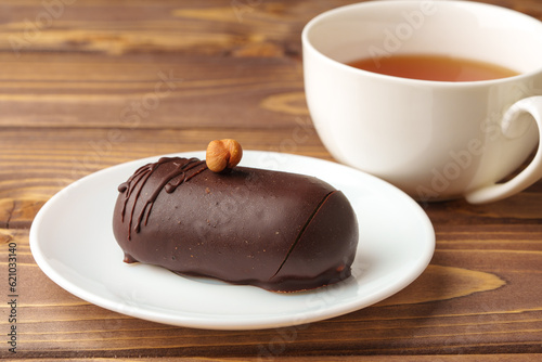 Delicious chocolate cake in white plate on wooden table background