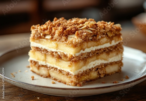 Delicious dessert of layered apple crumble with creamy filling served on a rustic plate with a cozy and inviting background setting