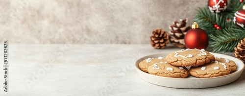 Delicious gingerbread cookies on a festive plate with holiday decorations for a warm and cheerful seasonal celebration