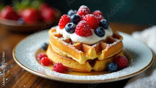 waffle, berry, blueberry, raspberry, whipped cream, powdered sugar, sirup, breakfast, dessert, sweet, delicious, gold, tasty, food photography, culinary, home cooking, appetising, fresh, fruity, light, plate, confectionery, baked goods