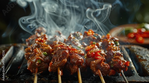 satay, grilled, skewer, meat, cooking, smoke, spice, evening, bar-b-q, street, food, culinary, delicious, charcoal, herb, favor, meal, grilling, picnic, savoury, fire, heat, garnished, dinner, colourful, preparation, aroma, feast, roaster, grill, lover, marinade, tasty, healthy, vibrant, sizzle, epicure, cookout, chef, technique, cookery, time, summer, smoky, taste, party