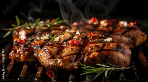 Delicious grilled steak garnished with herbs and spices, showcasing rich flavor and appetizing textures in a smoky environment.