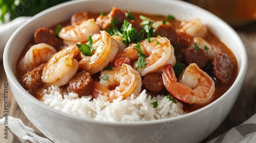 gumbo, shrimp, sausage, rice, presentation, bowl, food, cookery, tasty, dish, ingredient, cooking, meal, herb, seafood, comfort, delightful, vibrant, savoury, louisiana, culinary, homemade, receipe, flavorful, colourful, dining, plate, dinner, lunch, feast, garnish, traditional, fresh, preparation, steaming, serving, appetising, spice, texture, enjoy, warm, nourishment, aromatic, eatery, chef