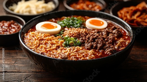 Delicious korean ramyeon with sesame toppings and gochujang cozy wooden table setting