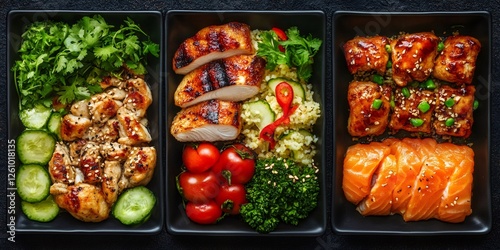 lunch box, health food, healthy eating, balanced diet, take-away, chicken, salmon, fish, vegetable, rice, cucumber, broccoli, tomatoes, coriander, teriyaki, grilled, nourishment, diet, protein, wellness, lifestyle, delicious, fresh, colourful, topview, variety, assortment, portion, container, black background, food photography, culinary, cookery, eatery, catering, menu