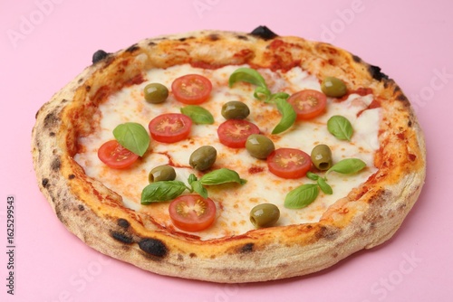 Delicious pizza with tomatoes, olives and basil on pink table, closeup
