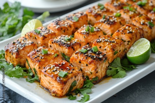 salmon, food, fish, roasted, sesame, healthy, meal, dinner, lunch, cookery, delicious, epicure, cooked, dish, eating, fresh, green, ingredient, lemon, nourishment, plate, protein, eatery, seafood, serving, snack, tasty, white, baked, citrus fruit, coriander, cilantro, parsley, chives, portion, square