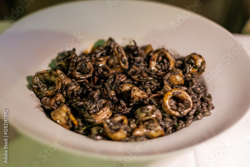 Delicious seafood dish featuring mollusks and black beans served in a local restaurant at night