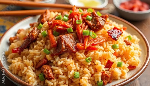Delicious stir-fried rice with meat and vegetables on a plate, ready to eat