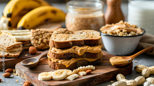 Delicious Variety of High-Protein Peanut Butter Foods Displayed on a Rustic Kitchen Counter