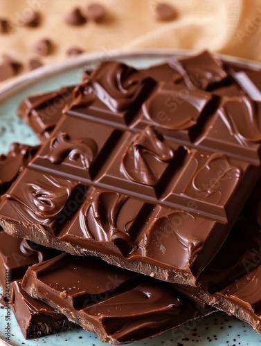 Deliciously crafted dark chocolate squares arranged on a decorative plate with chocolate chips in the background