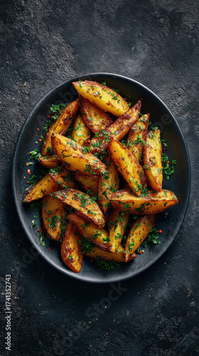 Deliciously seasoned potato wedges arranged on a dark plate, a culinary delight ready to be savored. The image evokes feelings of warmth, comfort, and enjoyment.