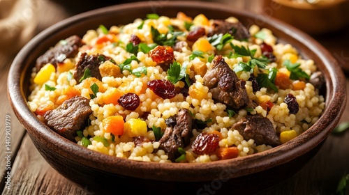 Delight in a vibrant bowl of wholesome couscous. A medley of grains, tender meat, and sweet dried fruits create a balanced dish.
