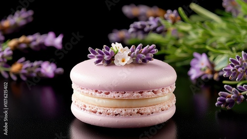 Delight in the elegance of lavender macarons enhanced by fresh floral accents