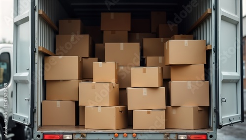 Delivery truck cargo area filled with various sized cardboard boxes. Logistics transport concept. Goods ready for shipment delivery to warehouse. Industrial commerce in action. Stacked boxes show