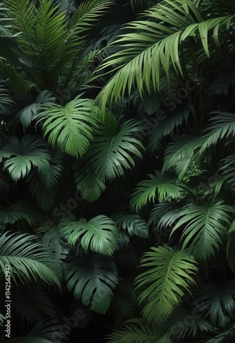 Dense cluster of green palm leaves on a dark background in a lush tropical jungle garden, green, nature, tropical