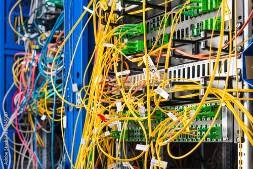 detail of server rack with fiber optic cables attached to front