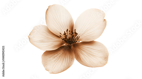 Detailed flower, five petals, soft texture, rich brown color, sepia tone, white background
