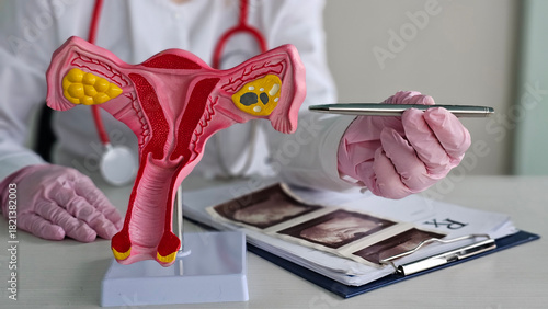 Detailed model of female reproductive system shown by a healthcare professional in a clinical