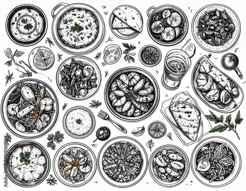 "Detailed monochrome sketch of various international dishes, vintage engraving style, full HD, sharp lines and food textures"
