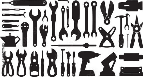 tool, hand tool, silhouette, wrench, plier, screwdriver, hammer, drill, hardware, repair, maintenance, construction, equipment, spanner, cutter, craft, design, vector, illustration, mechanic, carpenter's shop, home improvement, workshop, fix, engineer, build, metal, steel, black