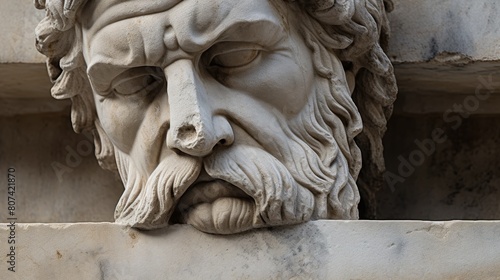 classical style, architectural element, stone carving, facial features