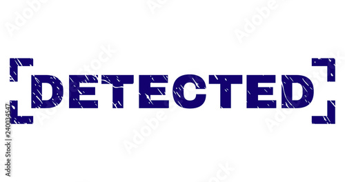 DETECTED tag seal print with corroded style. Text title is placed inside corners. Blue vector rubber print of DETECTED with retro texture.