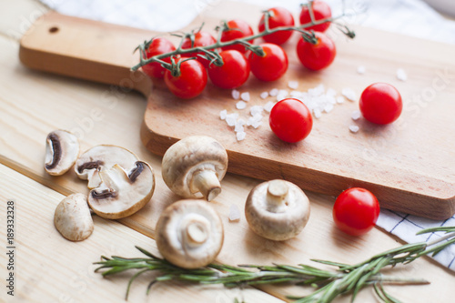 Diet, Healthy Food Cooking, Vegetarian Concept. Fresh organic cherry tomatoes, rosemary and button mushrooms on a wooden cutting board