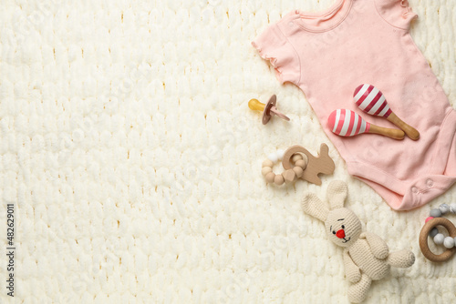 Different baby stuff on light knitted fabric, flat lay. Space for text