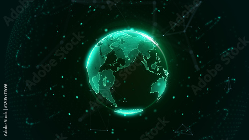 Digital global network solution platform with data connection transfer concept. Green earth planet spinning on the center of galaxy space illustration.