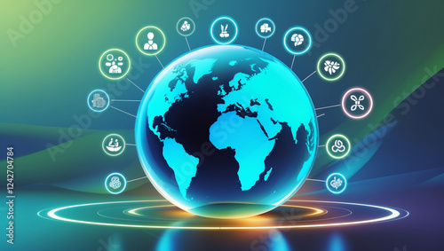 Digital Illustration of a Glowing 3D Globe Surrounded by Cooperation Icons for International Day of Cooperatives