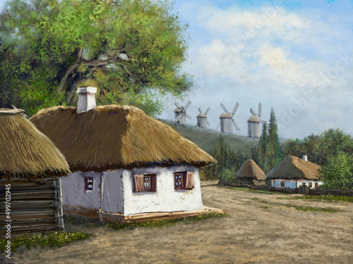 Digital oil paintings rural landscape, traditional ukrainian village house. Fine art, artwork