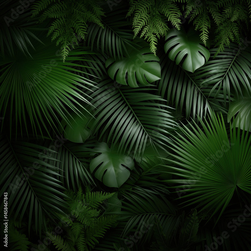Digital stock illustration featuring tropical leaves with intricate details, showcasing vibrant greens and diverse textures, creating a lush and inviting natural environment for design projects