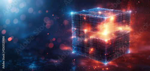 Digital technology concept with abstract geometric shapes and cube blocks on a white background.