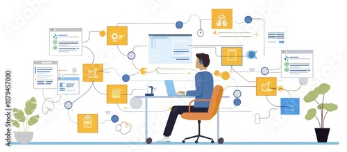 workflow, digital, illustration, person, working, desk, icon, connection, process, technology, business, automation, software, system, optimization, datum, management, communication, collaboration, efficiency, productivity, integration, development, design, strategy, planning, implementation, monitoring, feedback, improvement, innovation, transformation, future, modern, abstract, minimal, flat, colourful