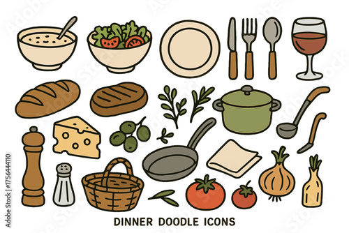 dinner, doodle, icon, icon, set, hand, drawn, soup, bowl, salad, steak, plate, knife, fork, spoon, wine, glasses, bread, cheese, olive, herb, pot, pan, ladle, pepper, mill, salt