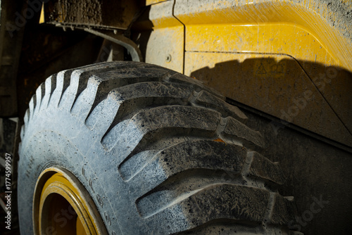 Dirty heavy duty tire of construction machinery with detailed tread structure showing strength, durability and industrial power used on rugged worksite terrain and harsh outdoor conditions