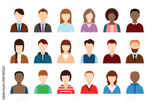 Diverse Avatar Set: A collection of diverse flat-design avatar icons, representing a variety of ethnicities, genders, and hairstyles. Perfect for user profiles, social media, or website design.