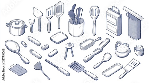Diverse collection of kitchen tools and utensils in an isometric view. Various cooking equipment, from pots and pans to spatulas and spoons, showcased in