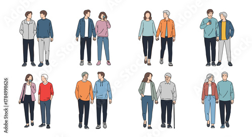 couple, holding hands, walking, together, illustration, people, human, human relationships, love, romance, connection, street, casual attire, clothing, fashion, style, modern, young, old, age, diversity, representation, graphic design, digital artwork, art, design, white background, isolated, collection, set, group, various, different, pair, companionship, friendship, partnership, social, interaction, movement, activity, motion, character