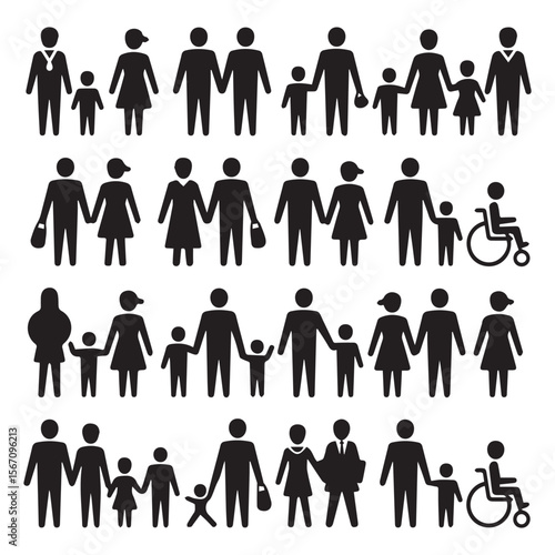 family, people, icon, silhouette, group, diversity, inclusion, community, together, children, man, woman, children, couple, disability, wheelchair, accessibility, human, figure, symbol, representation, human relationships, connection, society, oneness, different, type, background, white, black, graphic, design, collection