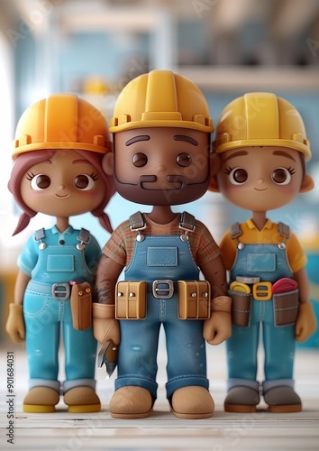 Diverse group of workers with tools, white background, 3D animation render
