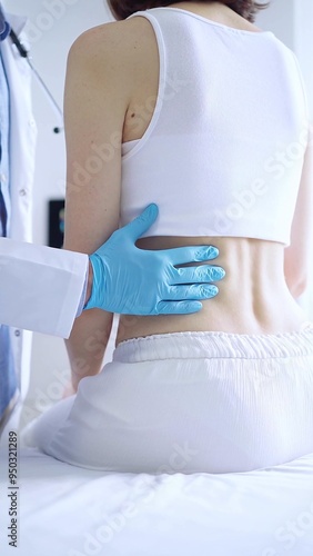 Doctor and patient. Physician wearing blue gloves examining back of female patient in clinic. Orthopedics in medicine