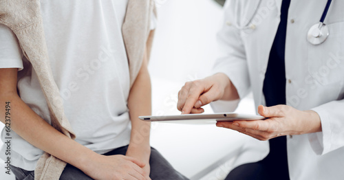 Doctor woman and kid boy patient at home. The pediatrician using tablet computer while filling up medical records, close up. Medicine, healthcare concept