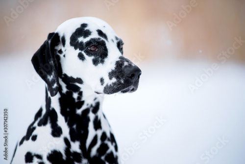Dog breed Dalmatian winter in the snow portrait closeup
