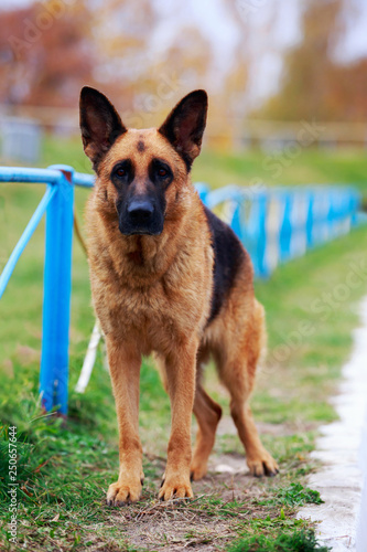 dog, breed, german, shepherd, german shepherd dog, standing, portrait, pet, fence, animal, young, closeup, purebred, thoroughbred, blue, 1, mammal, short, hair, wool, park, autumn, smile, abandoned, loneliness, sad, stadium, black, ginger, redhead, grass, green, cute, canino, nature, looking, background, open air, outdoors