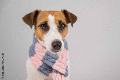Dog Jack Russell Terrier wearing a knit scarf on a white background.