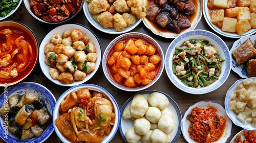 tradition, friends, feast, ravenous, taste, meat, vegetable, chinese new year, chinese food, favor, family, dish, sauce, white, gastronomy, plate, red, holiday, celebration, yellow, epicure, green, dumpling, food photography, yum, culture, topview, brown, dinner, bowl, table, cookery, delicious, fried food