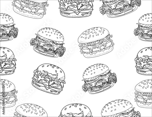 doodle burger pattern background. doodle fast food burger seamless pattern background. seamless pattern of hamburger in doodle style. Seamless Pattern of a Cheese Burger or Hamburger.