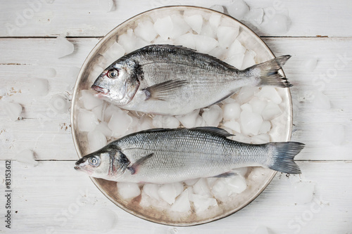 Dorado fish and sea bass on the metal plate with ice